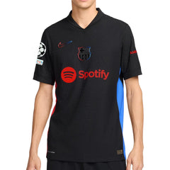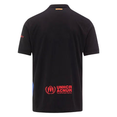 The Barcelona 24/25 Away Jersey showcases a sleek and modern design with a bold twist. The jersey features a deep black base, creating a striking and sophisticated look. This dark canvas is contrasted by vibrant blue and red accents on the collar and sleeves, paying homage to the club’s iconic colors. The Barcelona crest stands proudly on the chest, symbolizing the club's rich history and the unwavering support of its fans.