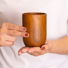 This handcrafted small teak wood cup is designed for everyday use while showcasing the natural beauty of solid teak. Each piece is carefully carved by skilled artisans, highlighting unique wood grain patterns that make every cup one of a kind. Strong, durable, and versatile, it is suitable for both hot and cold drinks, adding a warm, natural touch to your kitchen or dining table.