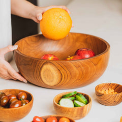 This large handcrafted teak wood serving bowl offers both durability and timeless style. Carved from solid teak, each piece highlights natural wood grain patterns and warm tones that make it unique. With its smooth food-safe finish, this versatile bowl is perfect for serving salads, pasta, rice, fruits, noodles, or soups, making it a beautiful and practical addition to any dining table.