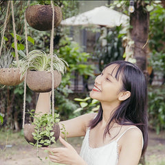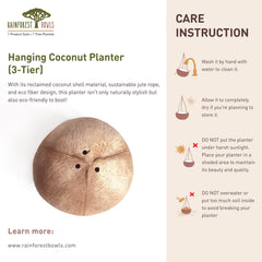 Add a natural, organic touch to your home or garden with this 3-tier hanging coconut shell planter, handcrafted from reclaimed coconut shells. Each tier is carefully shaped and polished to highlight its unique texture and tone. The planter features three stacked bowls connected by natural rope and includes a drainage hole to support healthy plant growth.