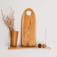 This handcrafted teak wood cutting board features a rectangular shape with rounded edges and an integrated handle for easy carrying. Designed for everyday kitchen use and entertaining, it serves as both a durable chopping board and an elegant serving platter for cheese, charcuterie, meats, fruits, or vegetables.