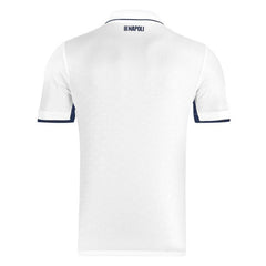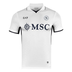 The Napoli 24/25 Away Jersey features a crisp white base that exudes purity and elegance. This minimalist design is enhanced with deep blue accents on the collar and sleeves, creating a striking contrast that honors Napoli’s iconic colors.
