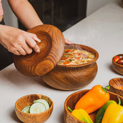 This handcrafted teak wood bowl with lid combines beauty and function in a timeless design. Made from solid teak, each piece features a ripple pattern that highlights the wood’s natural grain. With a food-safe finish, the bowl is suitable for hot and cold dishes, making it perfect for serving salads, soups, noodles, or storing dry foods. The included wooden lid helps keep contents fresh while adding an elegant touch to your kitchen or table.