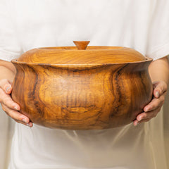 This handcrafted teak wood salad serving bowl with lid combines timeless craftsmanship and natural design. Made from solid teak, each piece features a ripple texture that highlights the wood’s organic grain and warm tones. Finished with a food-safe coating, it’s suitable for both hot and cold dishes. The matching lid makes it ideal for storing or serving salads, fruits, noodles, and other meals while maintaining freshness and style.