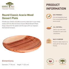 Bring natural beauty to your dining table with this 7-inch acacia wood plate. Each piece is handcrafted from solid acacia, showcasing unique grain patterns and a smooth, food-safe finish. Designed for everyday use, this plate is ideal for serving snacks, desserts, or sides while adding a warm, organic touch to any setting.