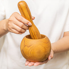 This handcrafted teak wood mortar and pestle set is designed for grinding, crushing, and mixing ingredients with ease. Carved from solid teak, it features a smooth, durable surface and natural wood grain variations that make each set unique. The sturdy bowl and pestle allow you to prepare guacamole, pesto, herbs, salsa, nuts, and spices with traditional style and functionality.
