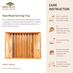 Carved from solid Javanese teak, each piece highlights unique grain patterns and rich tones. Known for its durability and resistance to water, teak wood ensures this tray will last for years of daily use. Finished with a food-safe natural oil, it is suitable for both hot and cold foods.